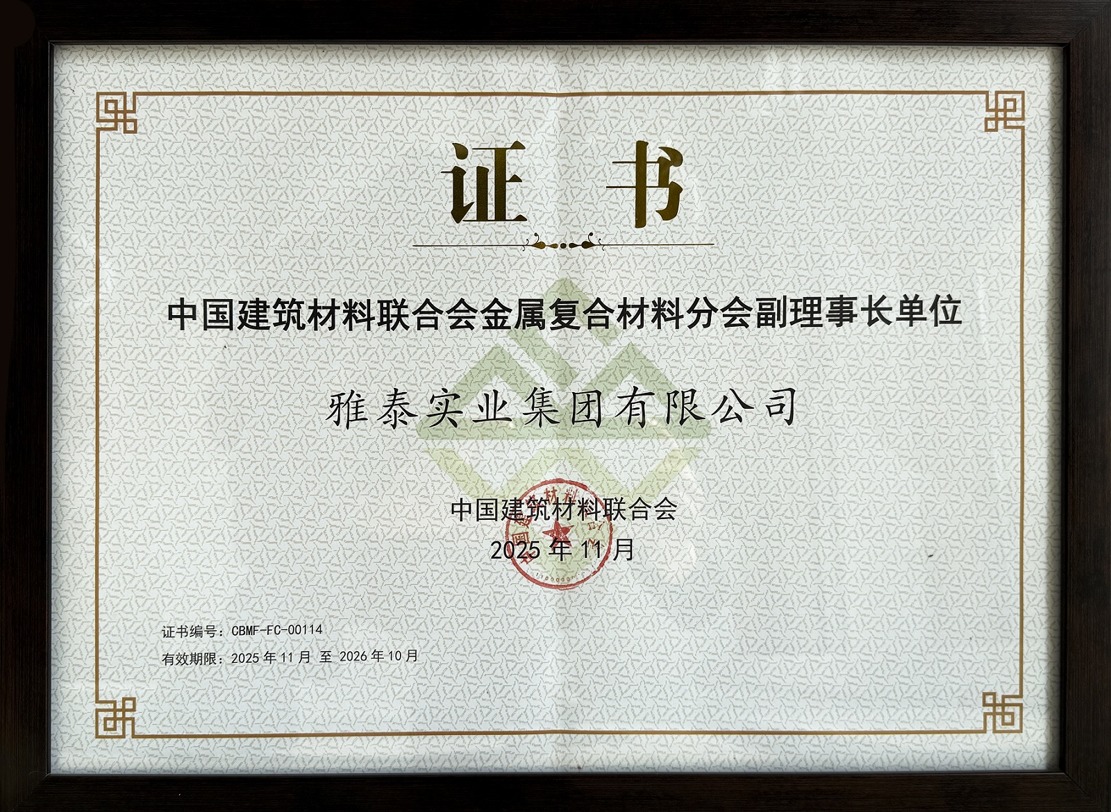 同時,雅泰實業(yè)集團作為幕墻行業(yè)優(yōu)秀的國內(nèi)老字號品牌,也長年擔(dān)任著中國建筑材料聯(lián)合會理事、金屬復(fù)合材料分會副理事長等角色。
