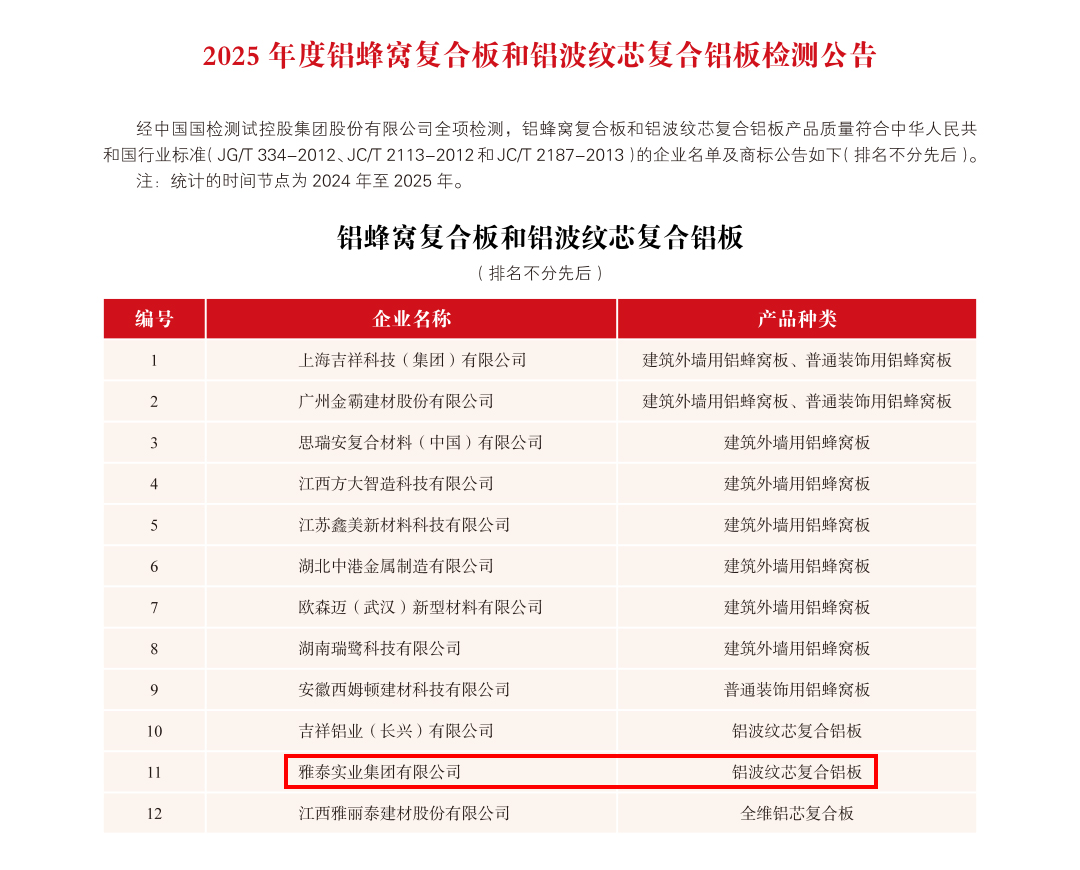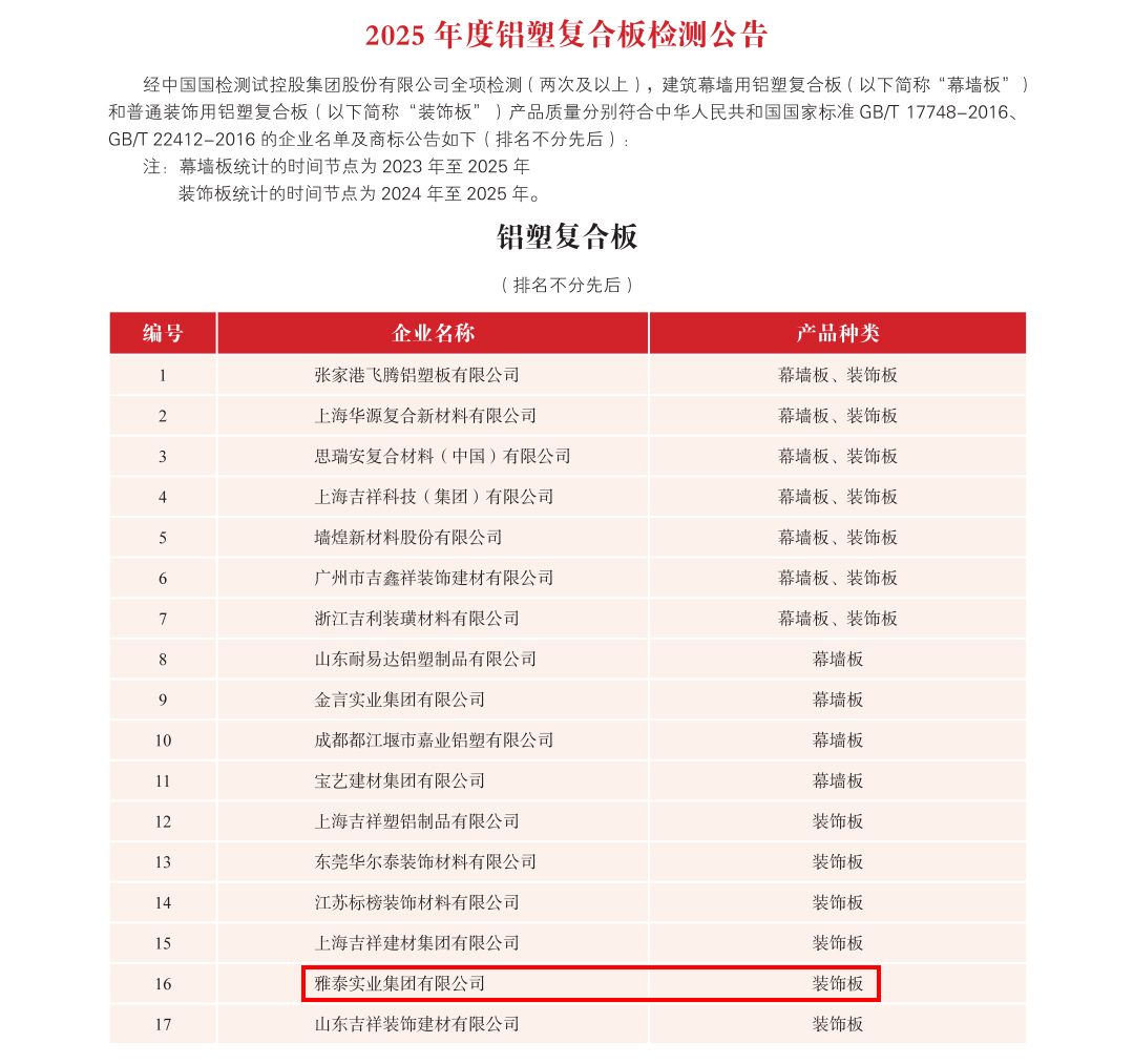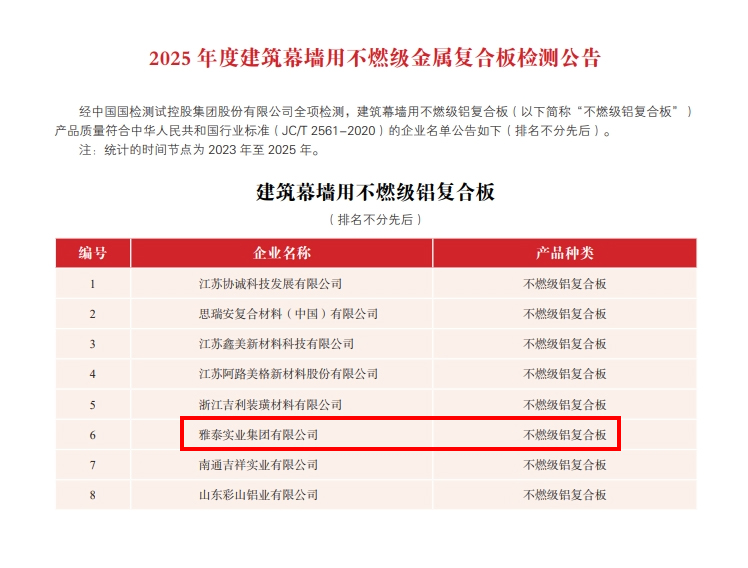 為加強金屬復(fù)合材料行業(yè)品質(zhì)建設(shè),提高行業(yè)整體質(zhì)量,金屬復(fù)合材料分會聯(lián)合中國國檢測試控股集團股份有限公司對符合全項檢測要求的鋁塑復(fù)合板、鋁單板、建筑裝飾用不燃級金屬復(fù)合板、鋁蜂窩復(fù)合板和鋁波紋芯復(fù)合鋁板等生產(chǎn)企業(yè)頒發(fā)2025 年度產(chǎn)品合格證,具體公告如下: