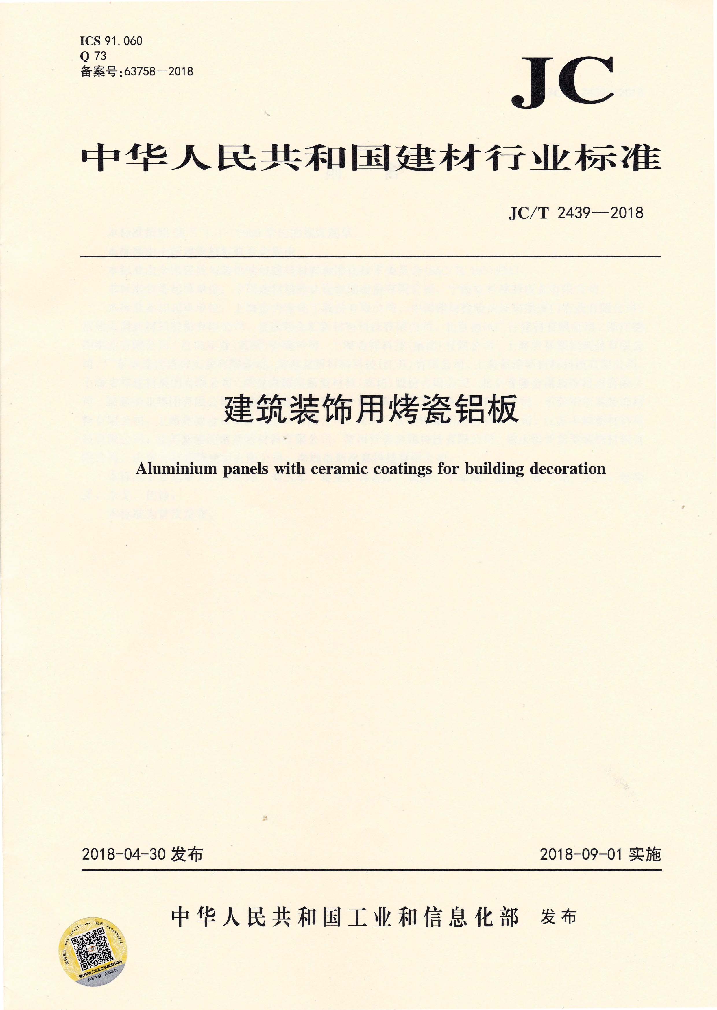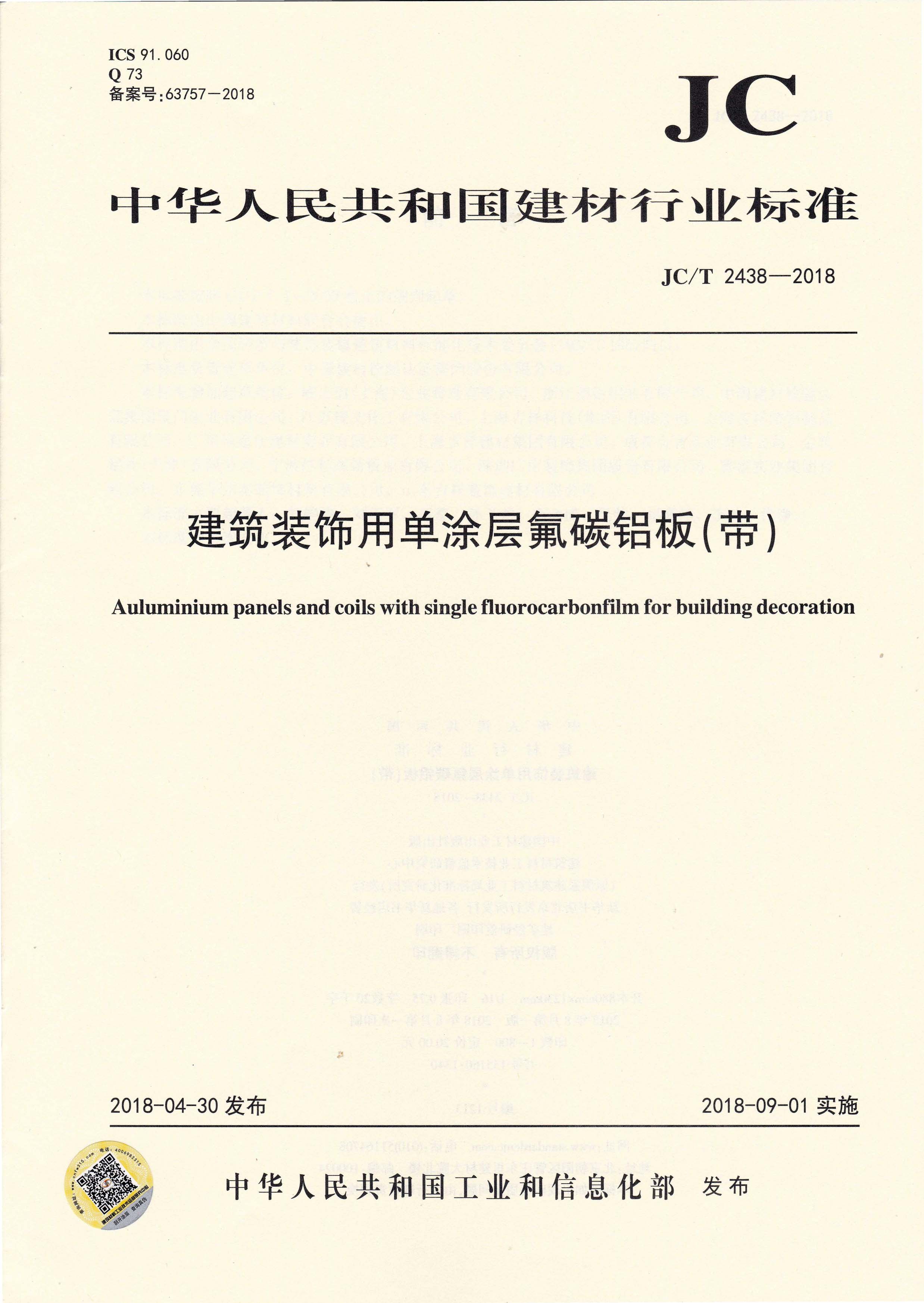 近日,由中國建筑材料聯合會提出,雅泰實業(yè)集團有限公司參與起草的JC/T 2439-2018《建筑裝飾用烤瓷鋁板》、JC/T 2438-2018《建筑裝飾用單涂層氟碳鋁板(帶)》兩項行業(yè)標準于2018年4月30日首次發(fā)布,2018年9月1日起正式實施。