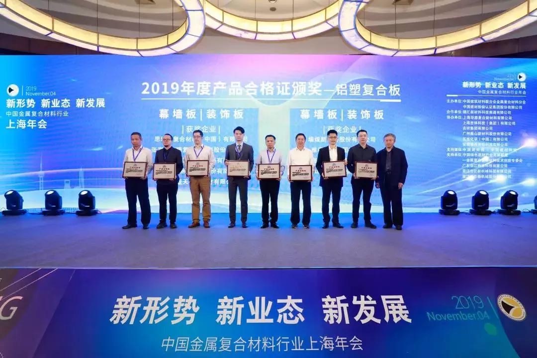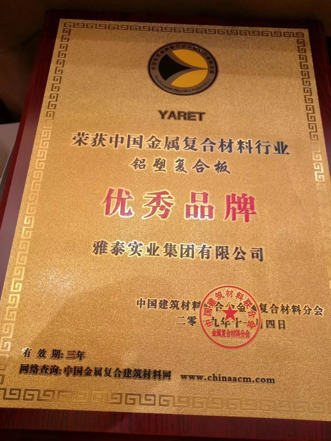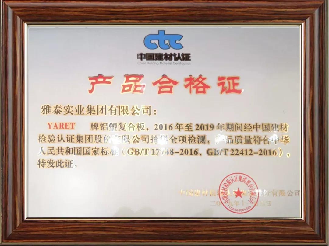 雅泰YARET牌鋁塑復(fù)合板,于2016年至2019年期間經(jīng)中國(guó)建材檢驗(yàn)認(rèn)證集團(tuán)股份有限公司抽樣全項(xiàng)檢測(cè),產(chǎn)品質(zhì)量符合中華人民共和國(guó)國(guó)家標(biāo)準(zhǔn)(GB/T 17748-2016、GB/T22412-2016),榮獲2019年度CTC認(rèn)證產(chǎn)品合格證;YARET牌鋁塑復(fù)合板、鋁單板、鋁蜂窩板榮獲中國(guó)金屬?gòu)?fù)合材料行業(yè)優(yōu)秀品牌。